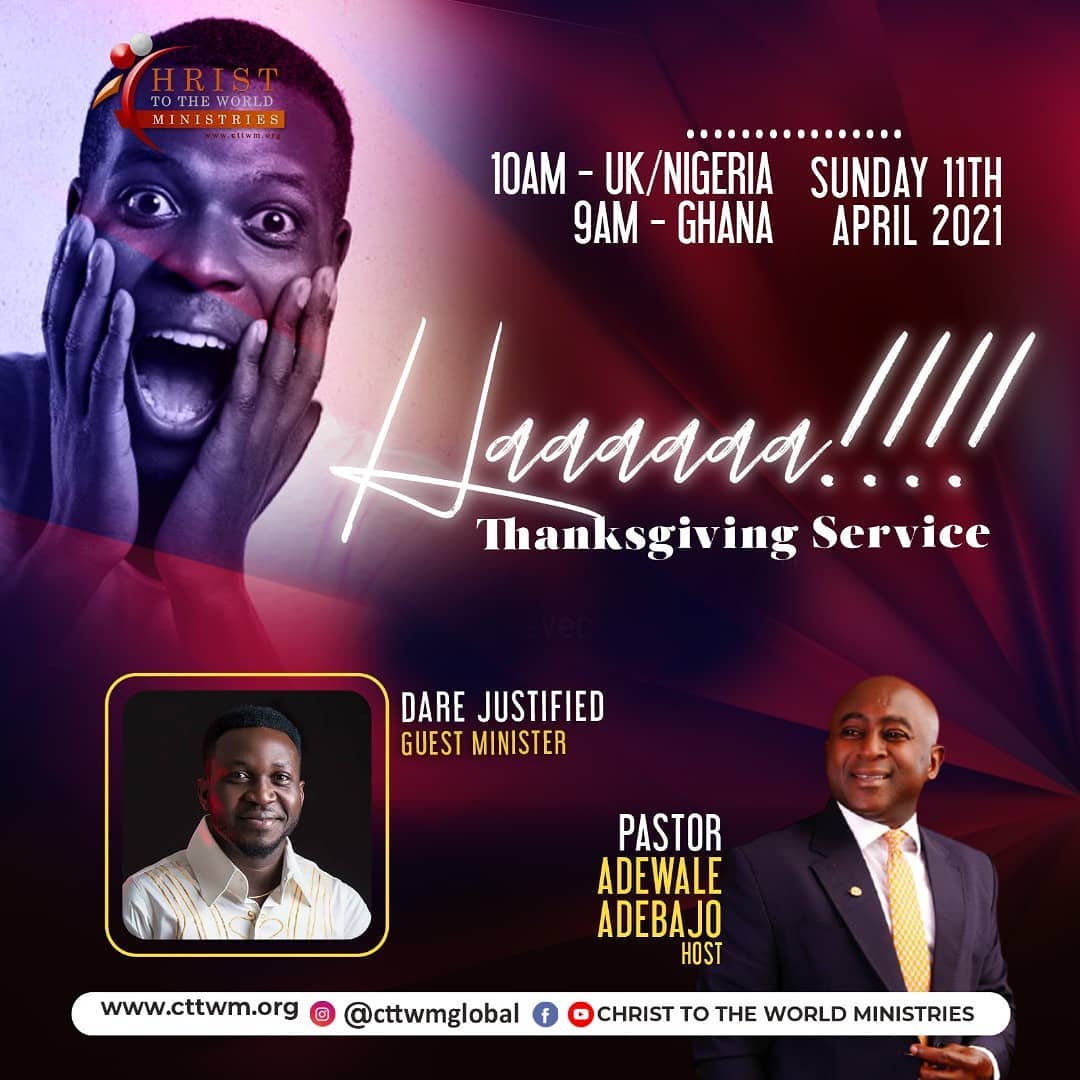 Join us this Sunday for a special Thanksgiving service. Ministering are our host Pastor Adewale Adebajo in a sermon tagged “Haaaaa” , Guest Minister Dare Justified @darejustified and CTTWM Worship Team. Don’t miss this meeting.