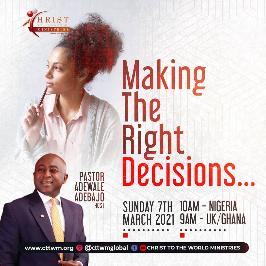 Join us tomorrow for another awesome time in the presence of God. Ministering is our host Pastor Adewale Adebajo in a sermon tagged “Making The Right Decisions” and our worship team. Don’t miss this meeting.